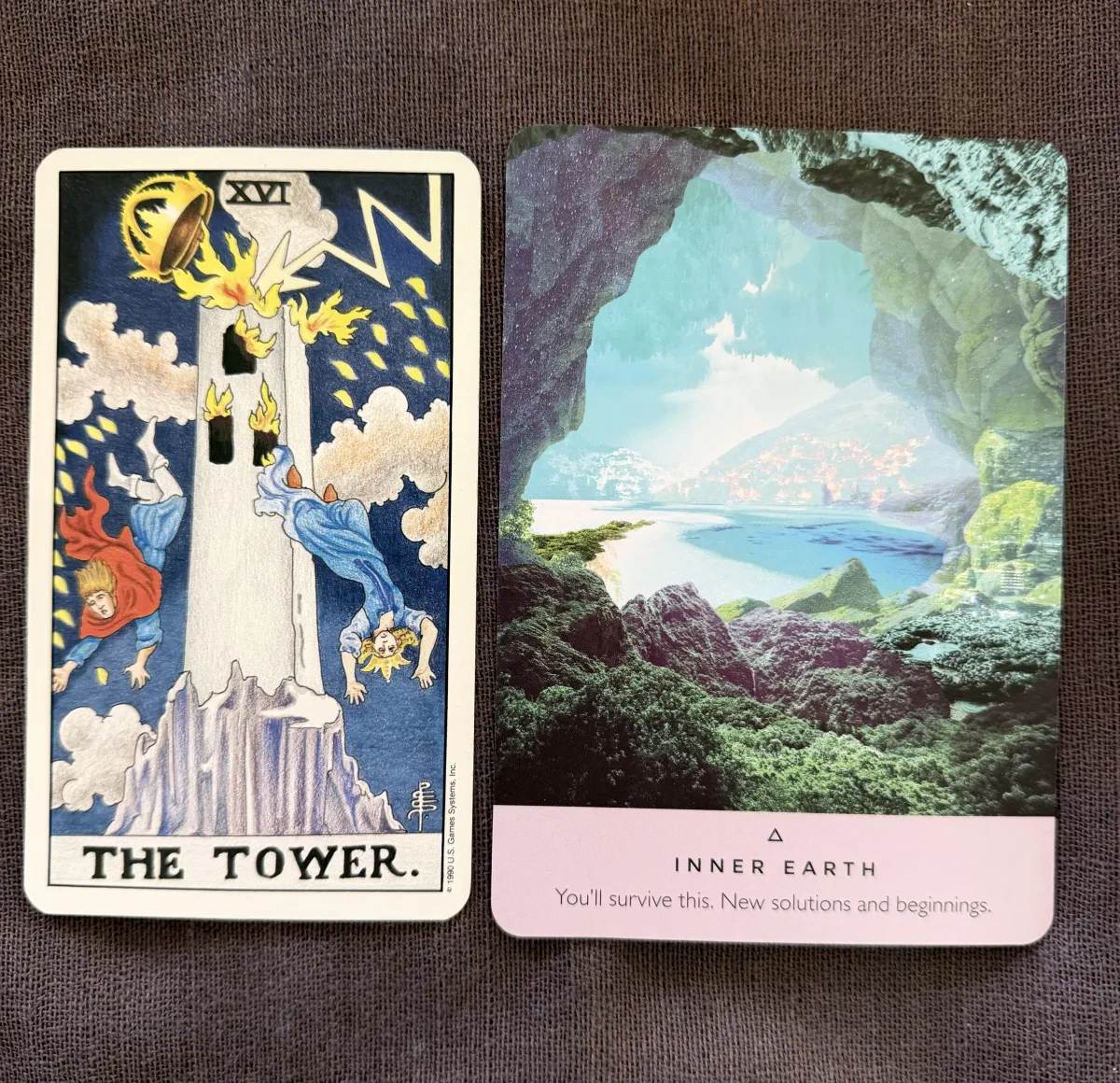 The Tower card? The wake-up call we need to bring us back to reality. Yes, things may be falling apart, but only because the initial security and protection they offered have now turned into something that inhibits growth.
